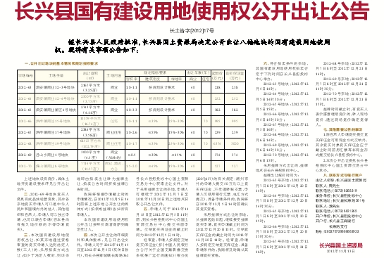 四、本次公开出让的详细资料和具体要求,见公开出让文件。申请人可于2012年11月15日至2012年12月5日(双休日除外),到长兴县雉城镇长海路361号长兴县招投标中心国土资源交易分中心获取出让文件。对于采用挂牌出让的宗地,申请人可继续于2012年12月7日至2012年12月20日到上述地点获取公开出让文件。