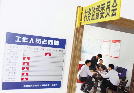 嘉善县优家村村务监督委员会成员和村民代表正在查询财务收支情况。 胡凌翔 摄