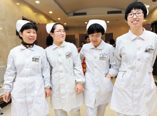 11月13日,杭州街头急救伤者的四位“最美护士”朱小芳、陈峰敏、奚彩芬和寿晓霞去病房探望已脱离生命危险的高金国。