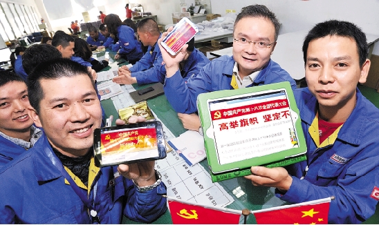 连日来,全省各地组织干部群众认真学习十八大报告。图为瑞安市长城换向器公司的党员们通过平板电脑、手机观看十八大会议内容。 孙凛 摄