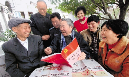 ◀11月13日,德清县乾元镇老党员李烈钧在社区宣讲十八大精神。