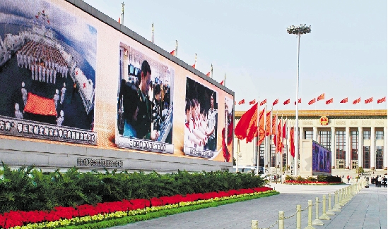 党的十八大召开期间,天安门广场上的大视屏滚动播放科学发展辉煌成就。 本报记者 黄曙林 摄