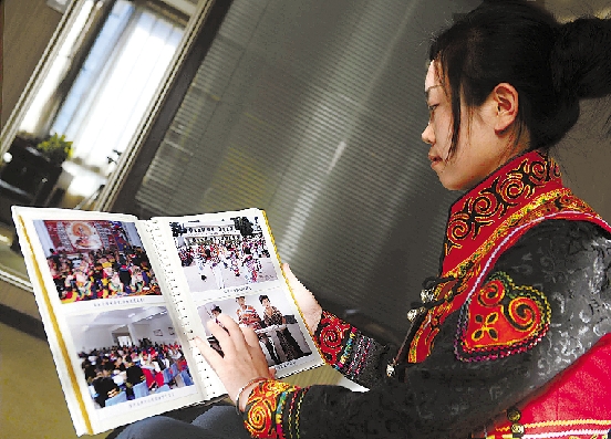 十八大代表马剑霞在展示她带来的相册。马剑霞是四川省凉山彝族自治州雷波县大坪子乡中心校校长,相册右页的两幅照片:下为学生们在老教室坐着破桌椅上课,上为学生们在新校舍操场上演奏乐器(11月12日摄)。