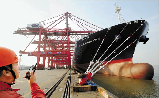 11月7日,刚从韩国釜山下水的全球最大集装箱船“达飞·马可波罗”首航宁波港。 龚国荣 张洁 摄