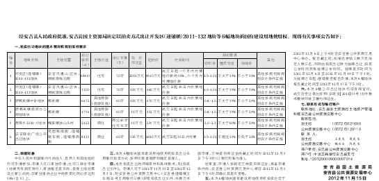 经安吉县人民政府批准,安吉县国土资源局决定以拍卖方式出让开发区(递铺镇)2011-132地块等6幅地块的国有建设用地使用权。现将有关事项公告如下: