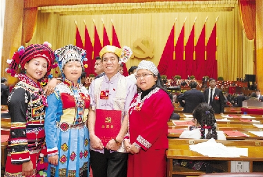 11月14日,中国共产党第十八次全国代表大会在北京人民大会堂胜利闭幕。这是大会闭幕后,四位代表在会场合影。 新华社记者 黄敬文 摄