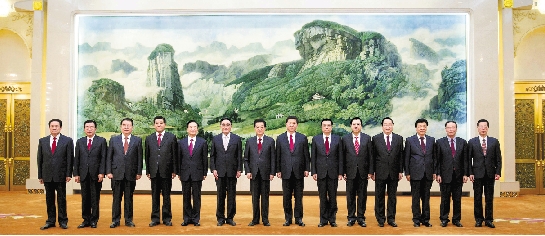 | 11月15日,国家主席胡锦涛,新当选的中共中央总书记、中共中央军委主席习近平,十七届中共中央政治局其他常委吴邦国、温家宝、贾庆林、李长春、贺国强、周永康,十八届中共中央政治局其他常委李克强、张德江、俞正声、刘云山、王岐山、张高丽一起合影。 新华社记者 兰红光 摄 |