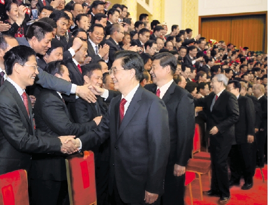 11月15日,国家主席胡锦涛,新当选的中共中央总书记、中共中央军委主席习近平等领导同志在北京人民大会堂亲切会见出席党的十八大代表、特邀代表和列席人员并发表重要讲话。 新华社记者 鞠鹏 摄