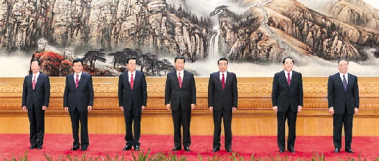 11月15日,刚刚在党的第十八届中央委员会第一次全体会议上当选的中共中央总书记习近平和中共中央政治局常委李克强、张德江、俞正声、刘云山、王岐山、张高丽在北京人民大会堂同采访十八大的中外记者亲切见面。 新华社记者 谢环驰 摄