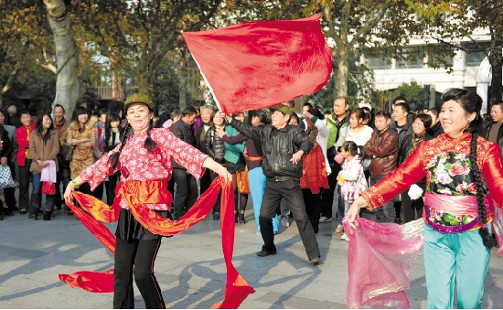 11月17日,杭州西湖三公园传来悦耳的歌声,大伯大妈们载歌载舞,表达对美好生活的期待。
