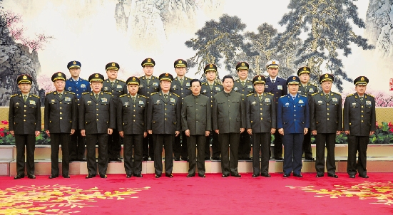 11月16日,胡锦涛同志和中共中央总书记、中央军委主席习近平与出席中央军委扩大会议的新老军委领导合影。
