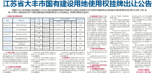 九、本次挂牌出让的有关事项如有变更,出让人将在挂牌截止日一周前在中国大丰(www.dafeng.gov.cn)、江苏土地市场网(www.landjs.com)、中国地产投资网(www.cnestate.com)、中国国土资源网(www.clr.cn)、《盐阜大众报》、《新华日报》、《浙江日报》、《 中国国土资源报》等媒体上公告。