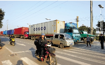 今年前10个月,义乌出口达60.9亿美元,同比增长1.1倍。11月14日,装运小商品的集装箱大货车在义乌物流中心门前雪峰路上排起长队。