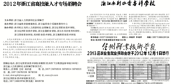 2013年学校有共计水利类、建筑类、机电类、计算机类、经管类等37个专业2756名毕业生。为了给用人单位与学校毕业生提供更好的“双向选择”机会,定于2012年11月28日召开 “浙江水利水电专科学校2013届校园招聘会”,特邀请用人单位参加。现将本次招聘会有关事项通知如下: