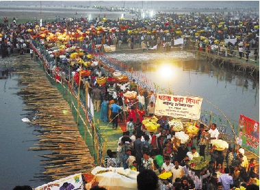 11月19日,在印度东部比哈尔邦首府巴特那,参加太阳神节的人们从竹桥上走过。当日,约10万人在巴特那市庆祝太阳神节,人们经过河边一座临时用竹子搭建的桥时,竹桥因重压而坍塌,人们惊慌失措因而发生踩踏事故。印度警方当日说,至少20人在踩踏事故中死亡,其中大多是妇女儿童。 新华社发 |