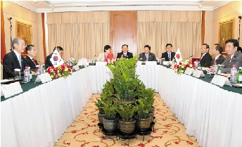 11月20日,中日韩三国经贸部长在金边第21届东盟及其系列峰会期间会晤,宣布启动中日韩自贸区谈判。 新华社发(赵乙深摄)