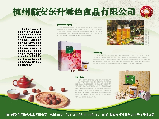 杭州临安东升绿色食品有限公司 电话:(0571)63733488 61068526 地址:临安市环城北路399号8号楼2楼