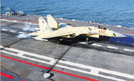 图为歼—15舰载机着陆时尾钩与“辽宁舰”飞行甲板上的阻拦索装置咬合。 新华社记者 查春明 摄