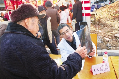 昨日,台州市科技人员驱车百余公里,到临海市河头镇举行科技下乡活动。图为台州医院专家为山区患者诊疗。 记者 斯信忠 通讯员 斯腾霄 陈凯笛 摄