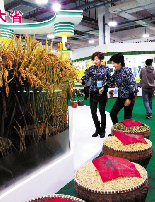 在农博会上,比人还高的水稻,引发参观者围观。 记者 杨军雄 摄