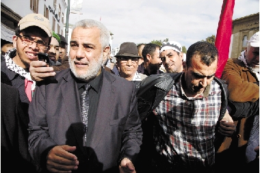 11月25日,摩洛哥首相本·基兰(中左)参加在首都拉巴特举行的游行活动。当日,来自摩洛哥各地的约15万民众在摩洛哥首都拉巴特举行大规模示威游行,声援巴勒斯坦人民,强烈谴责以色列对加沙地带的侵略行径。 新华社发