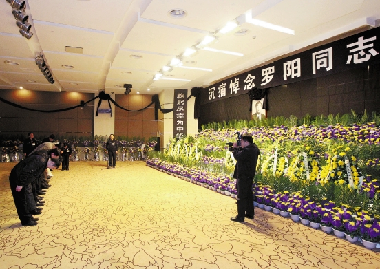 11月26日,在中航工业沈阳飞机工业(集团)有限公司,人们向罗阳同志遗像鞠躬。 新华社发