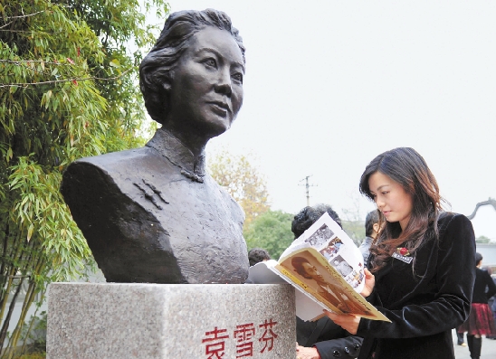 11月29日,越剧表演艺术家袁雪芬半身铜像在嵊州市中国越剧博物馆揭幕。嵊州是袁雪芬的家乡,袁雪芬生前经常称自己为“嵊州女儿”。 张亮宗 摄