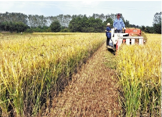 近日,长兴县水口乡后坟村,种粮大户戴炳其正在收割稻谷。