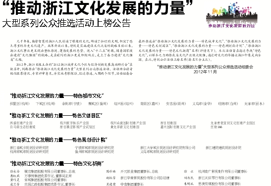 2012年,浙江日报主办的“2012浙江城市文化个性与经济创新发展高端研讨会”在杭召开,同期推出“推动浙江文化发展的力量”大型系列公众推选活动。活动结合读者短信投票情况、专家评审意见,并实地考察探访,经过推选、入围两个环节,活动组委会最终推选出“推动浙江文化发展的力量——特色城市文化”、“推动浙江文化发展的力量——特色文创园区”、“推动浙江文化发展的力量——特色规划设计院”、“推动浙江文化发展的力量——特色文化浙商”名单(详情见下)。本次活动旨在通过寻找“特色文化”,以样本之力助推我省文化产业做大做强,通过对文化的传播让浙江印象走向全国。在此,特别公示活动上榜名单(排名不分主次)。