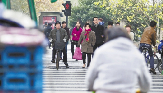 昨天,记者在杭州一些路口发现,行人和非机动车闯红灯现象屡见不鲜。 见习记者 朱卫国 摄
