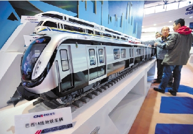 11月27日,第11届中国国际现代化铁路技术装备展览会在京开幕。参观者在观看中国北车集团出口巴西用于2016年夏季奥运会的专用地铁模型。