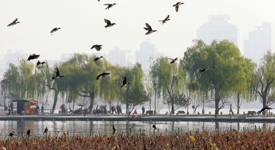 12月4日,初冬的西湖“荷尽已无擎雨盖”,成群的候鸟在湖上舞翩跹。