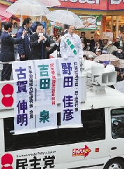 12月4日,日本首相、民主党党首野田佳彦(车上前排右二)在福岛参加竞选活动。为期12天的日本国会众议院竞选活动4日正式拉开序幕。从上午8时半起,日本中央选举管理委员会开始受理各政党的比例代表选区候选人名单,各都道府县选举管理委员会受理小选区候选人申请。 新华社发