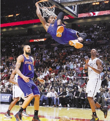 图为尼克斯队球员史密斯(上)在比赛中扣篮。 新华社发