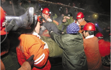 12月7日,救援人员正把营救上来的矿工抬下矿车。 新华社发(秦存广 摄)