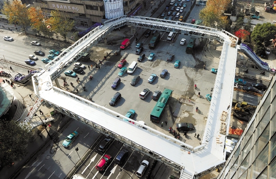 12月7日,杭州新解百天桥安装电梯,进入桥面装潢阶段。解百天桥于今年4月拆除重建,新桥将是杭州主城区最大的铝合金桥梁。