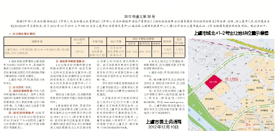 根据《中华人民共和国物权法》、《中华人民共和国土地管理法》、《中华人民共和国城市房地产管理法》、《招标拍卖挂牌出让国有建设用地使用权规定》等法律、法规,经上虞市人民政府虞政办发[2012]329号文件批准,定于2012年12月29日上午9时30分在上虞市公共资源交易中心(城北称山路便民服务中心三楼)公开出让上虞市城北41-2号地块国有建设用地使用权。现公告如下:
