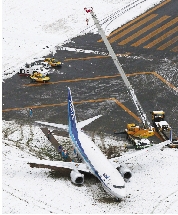 一架从东京羽田机场起飞的全日空公司客机8日夜间在山形县酒田庄内机场着陆时冲出跑道,所幸机上161名乘客和6名机组成员安然无恙。图为该客机停在庄内机场。 新华社发