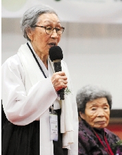12月9日,第十一届日军“慰安妇”问题亚洲团结会议在台北市剑潭国际会议中心开幕。图为“慰安妇”金福童在会上控诉第二次世界大战中日军的暴行。 新华社发(吴景腾 摄)