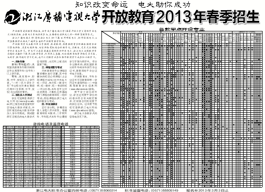 浙江电大招生办公室咨询电话:(0571)88060314 招生监督电话:(0571)88805149 报名至2013年3月3日止
