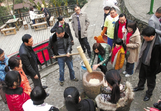 连日来,来自上海、南京等地的游客来到临安神龙川景区,和当地村民一起打年糕、包粽子、磨豆腐,体验民俗。