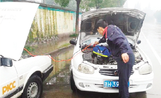 | 人保财险衢州分公司对所有事故查勘车辆都配备了施救包,随时为客户“救急”。图为查勘员在处理完一起车辆刮擦事故后,用施救包里的搭铁线帮客户启动车辆。 欧阳丽萍 摄 |