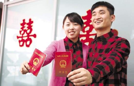 12月12日,杭州江干区民政局婚姻登记处,一对新人领了结婚证。 魏志阳 摄