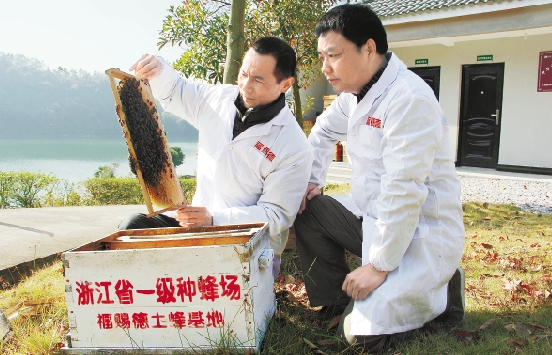 刘井根(左)就培育蜂种问题向行业专家取经。 郑积亮 摄