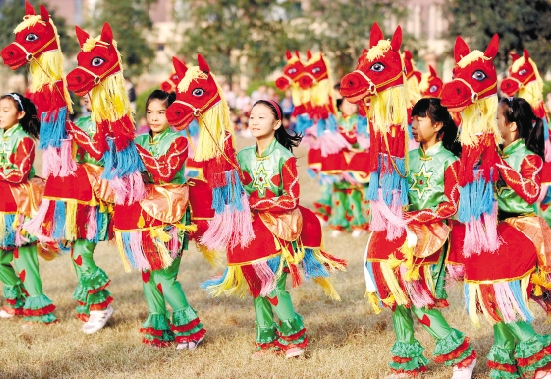 余杭仁和中心小学50位学生在操场上排练“高头竹马”。 本报记者 梁臻 通讯员 唐永春 陈连孝 摄