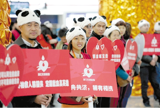 百名拥有Rh阴性血的献血者打扮成“熊猫侠”,在杭城参加“快闪”活动倡导无偿献血献爱心。 董旭明 摄