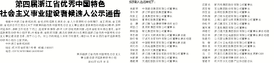 根据中共浙江省委统战部、省经济和信息化委员会、省人力资源和社会保障厅、省工商局、省工商联、省经济合作交流办《关于开展第四届优秀中国特色社会主义事业建设者表彰活动的通知》精神,按照评选条件,表彰工作经自下而上、逐级审核推荐;参评人所在地党委同意;征求省级有关单位意见,省评选表彰活动领导小组评审;并报省委、省政府同意,提出拟表彰的31名第四届浙江省优秀中国特色社会主义事业建设者名单,现予以公示。对公示的候选人如有不同意见,请在12月19日前向省评选表彰活动领导小组办公室反映。