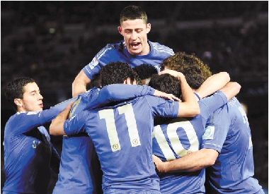 12月13日,在日本横滨进行的2012世界俱乐部锦标赛半决赛中,欧洲冠军切尔西队以3比1战胜北中美及加勒比冠军蒙特雷队,晋级决赛。图为切尔西队球员庆祝进球。 新华社发
