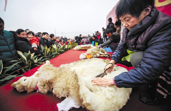 12月15日,长兴县吕山乡举办湖羊文化展示活动,包括湖羊展示、赶羊大赛、湖羊美食品尝等。图为剪羊毛大赛现场。