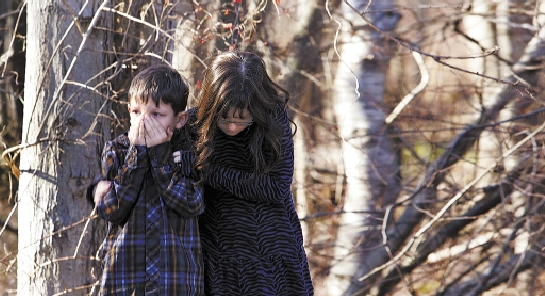 12月14日,桑迪胡克小学外,两名儿童在发生校园枪击案后惊魂未定。 新华社发